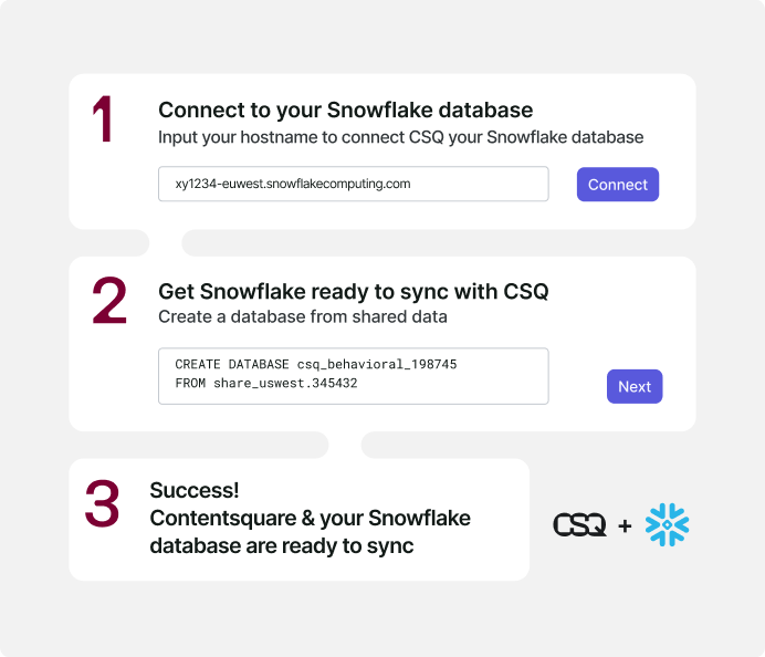 First-time setup had to feel approachable. We made the trial accessible from the landing page and offered a no-code, step-by-step form to connect any data warehouse to CSQ. No engineering required.